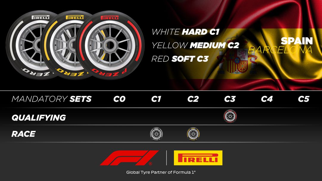 За Гран При на Испания пък изборът е на противоположния фронт, защото за надпреварата на „ Каталуния “ отборите ще могат да разчитат на С1, С2 и С3. Този избор на Пирели е подбуден от много по-бързите завои на испанското трасе, което през този сезон ще бъде още по-бързо, защото шиканът в последния бранш няма да се употребява.