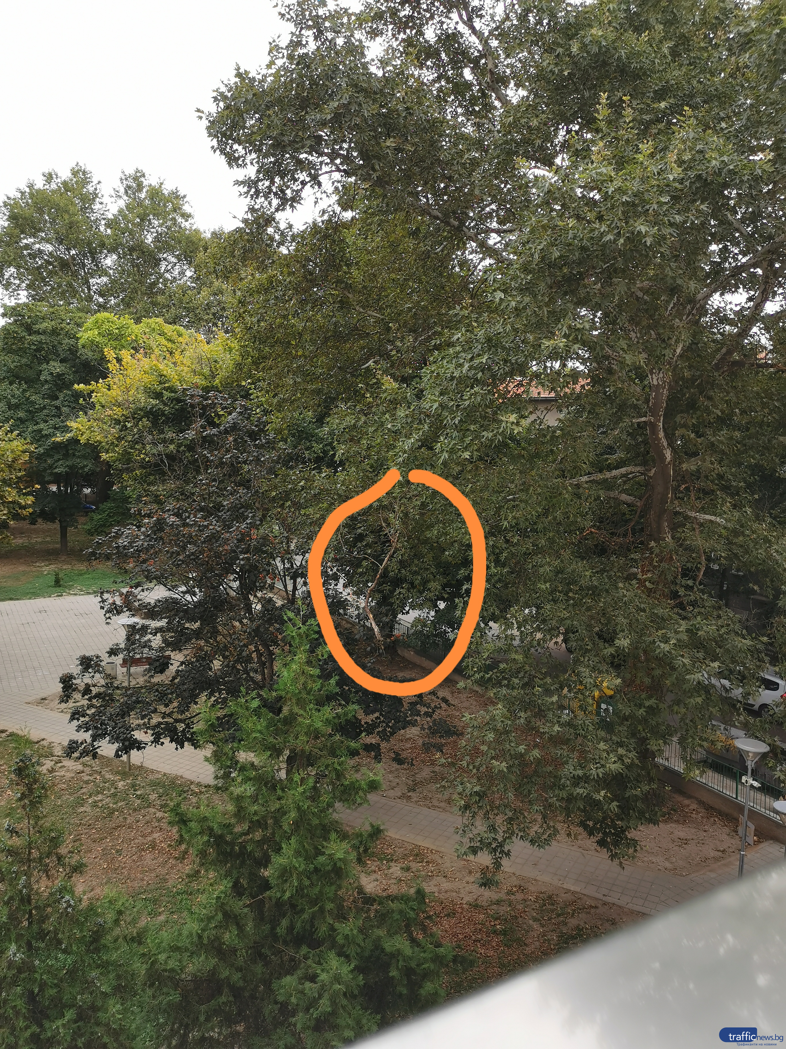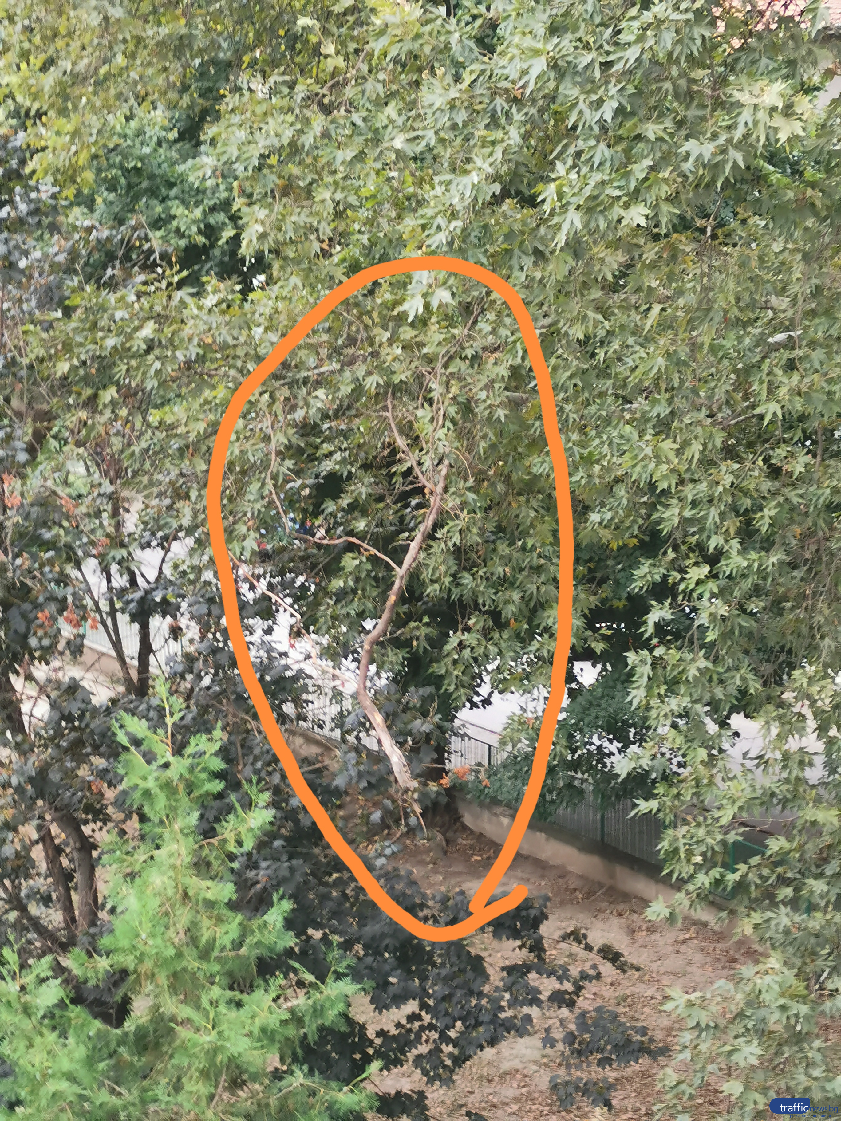 Огромен клон в парк в центъра на Пловдив може да падне всеки миг върху някого. За това алармира четец на TrafficNews , който живее в региона и твърди, че клонът е строшен и отпуснат, само че е закрепен за други клони, като това към този миг предотвратява рухването му.
