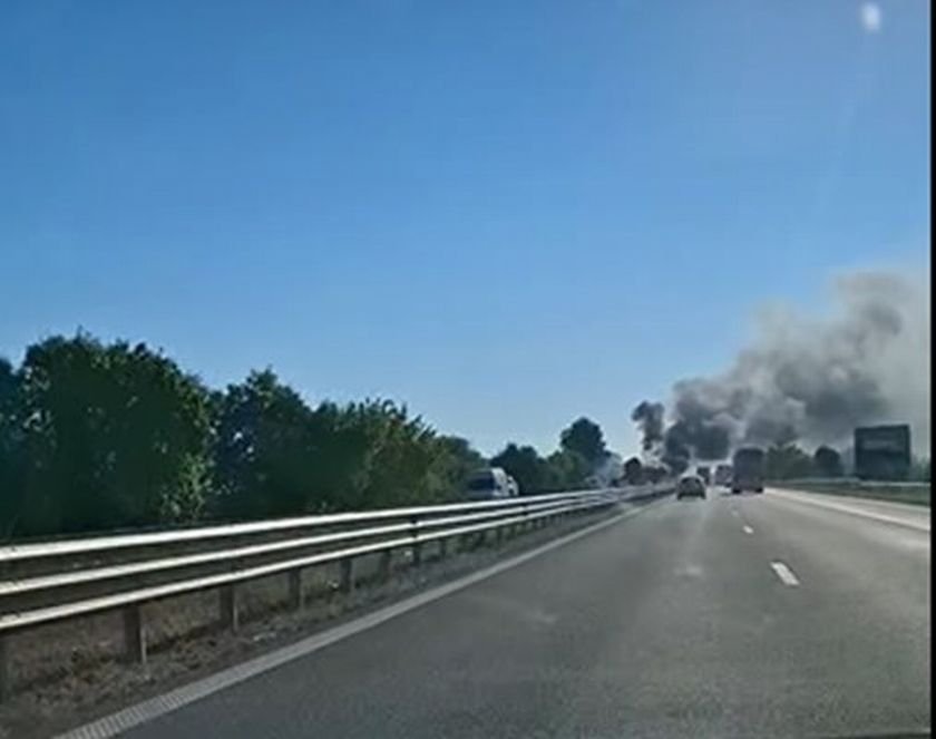 Огромни пламъци и гъст черен пушек се носят от горяща кола на автомагистрала " Тракия " до Пловдив, оповестяват водачи.