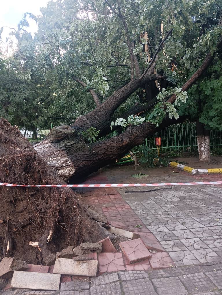 Огромно дърво се стовари в двора на учебно заведение " Д-р Петър Берон " в Пазарджик. То е разрушило тротоара и оградата.