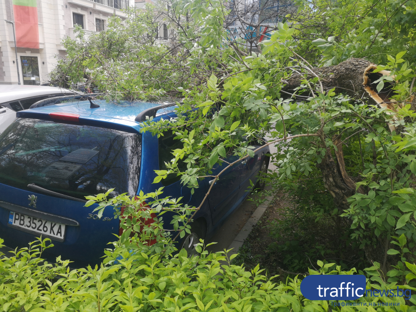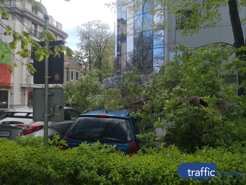 Огромно дърво се стовари върху автомобил в центъра на Пловдив