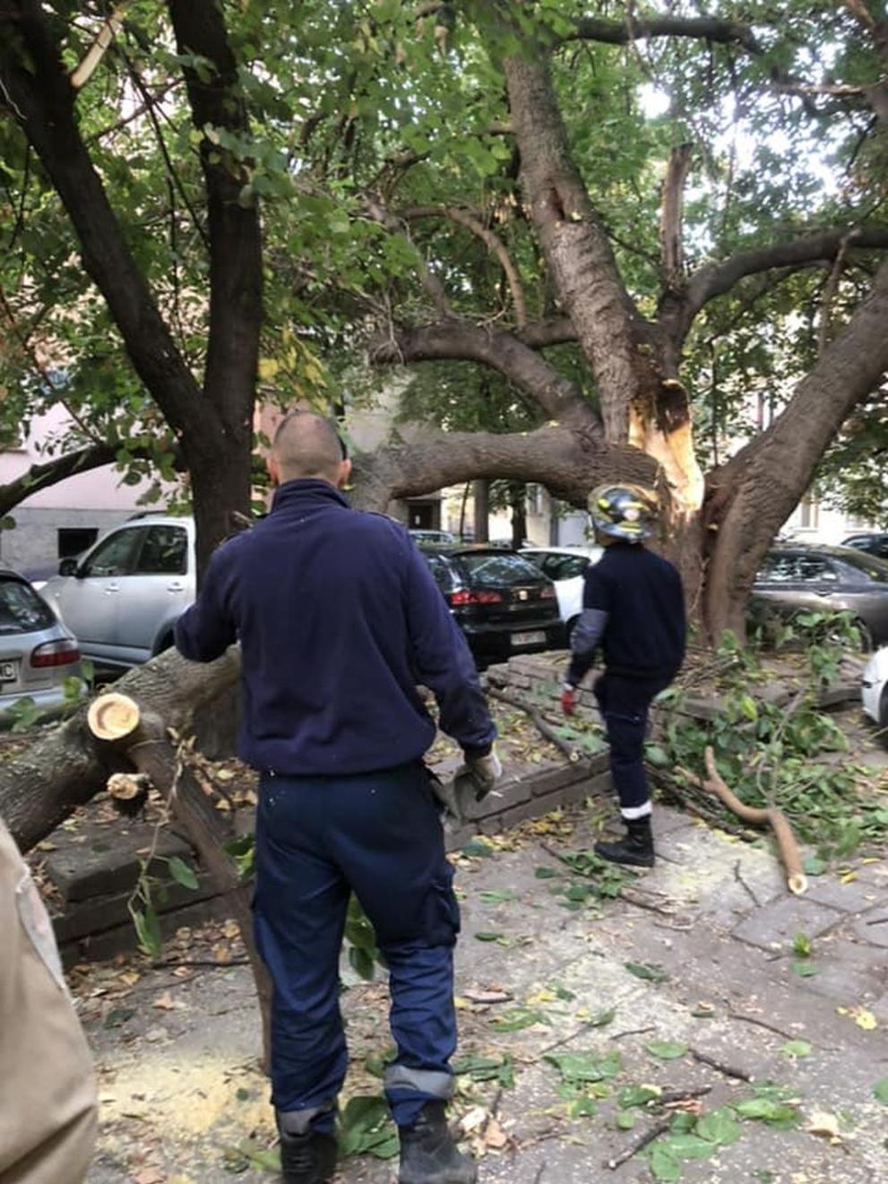 Мястото е ул. " Свети Горазд ". Два екипа от пожарната близо два часа са рязали на части падналото дърво и са разчиствали клоните.