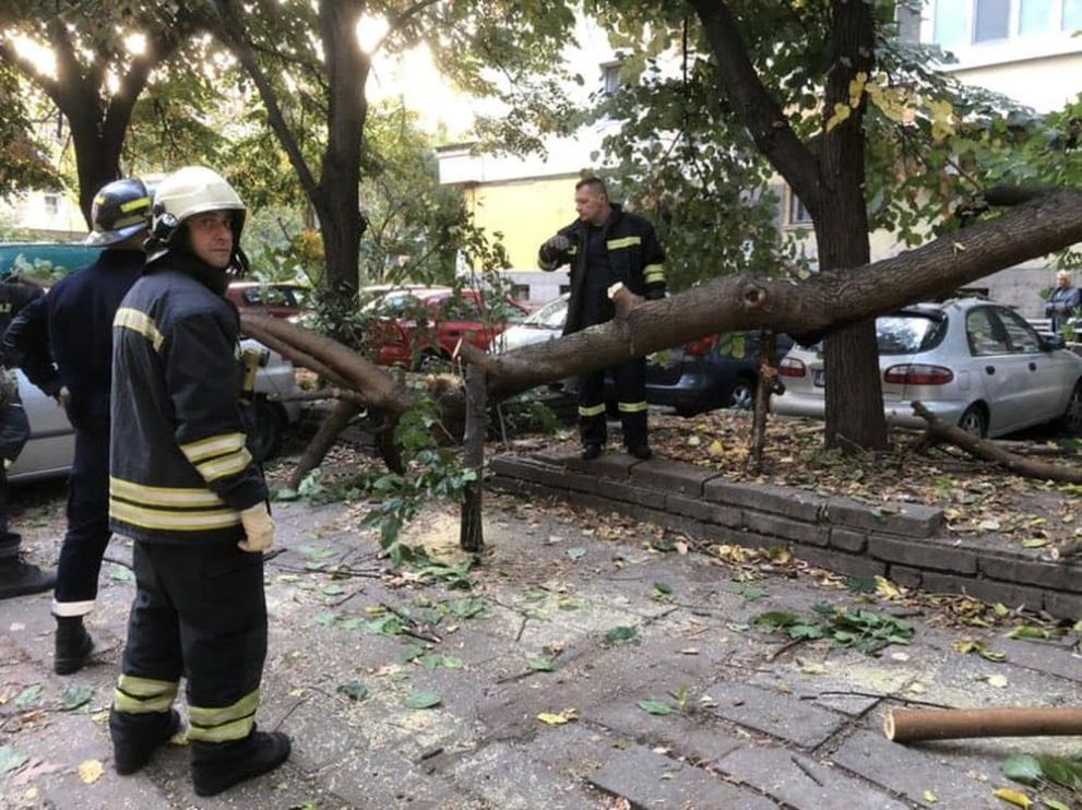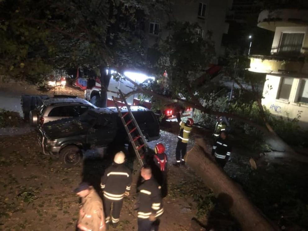 Нанесени са вреди върху нови 7 автомобила и част от дограмата на блока. Водач на автомобил, паркирал под дървото споделил, че за секунди се е разминал с случай.