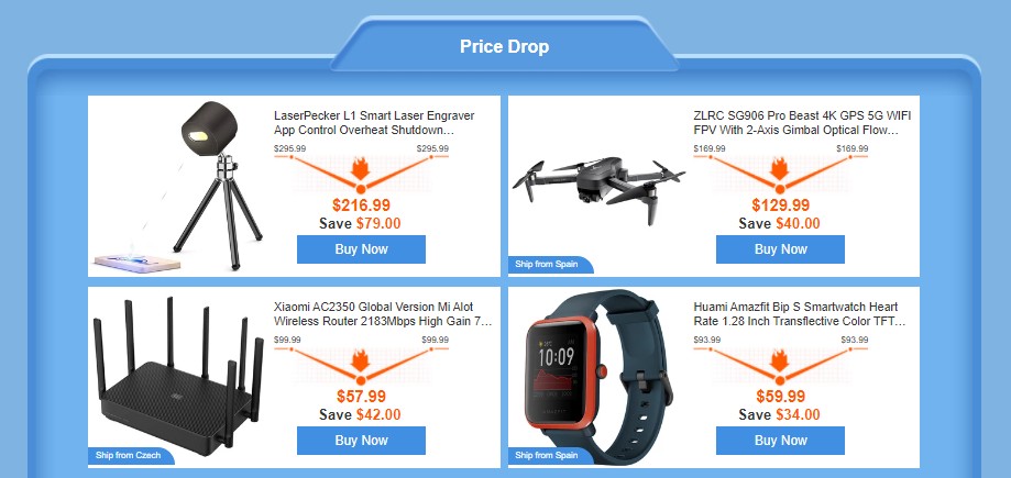 Внушителни понижения са оповестени в раздела Price Drop. Там можете да купите да вземем за пример Xiaomi рутер за $57,99, като спестите $42,00. Или смарт часовник Huami Amazfit Bip S за $59,99, спестявайки $34,00. А за какво не дрон MJX B20 за $165,99, възползвайки се от понижение с $34,00.
