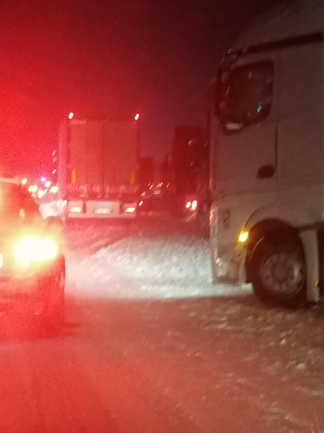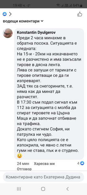" Движението е отклонено през Нови хан, тъй като баира преди Еко-то на Вакарел е задръстен от тирове и няма късмет да бъде почистено преди да ги разкарат. А колоната зад тях е най-малко 5-6 км в това число и снегорините са там.