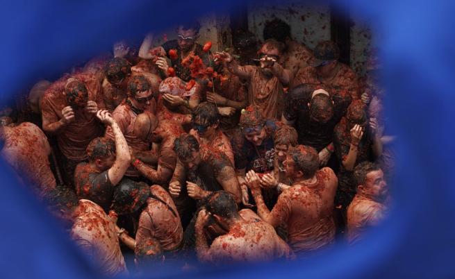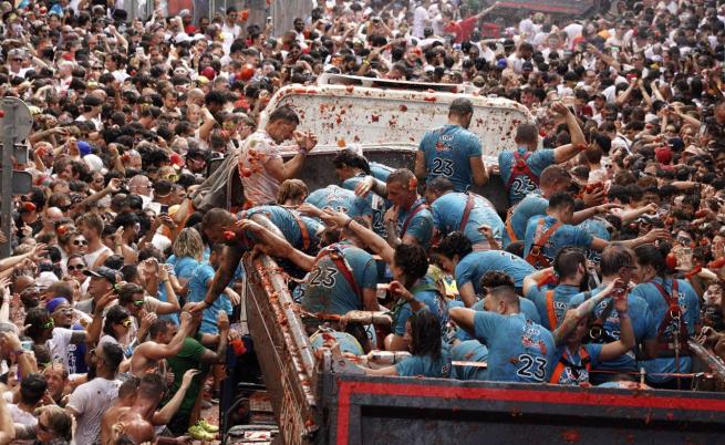 Около 15 000 души, включително и доста туристи, се замерваха със зрели домати в обичайна борба на фестивала " Томатина " в испанския град Буньол, съобщи Асошиейтед прес.