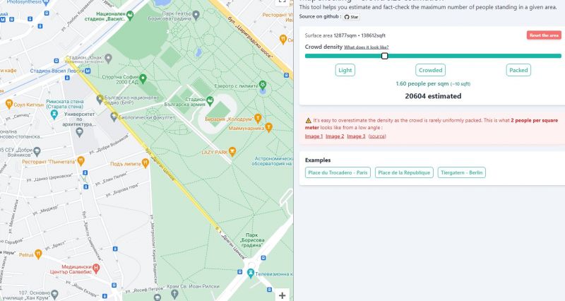 За оценката използвахме закостенял индикатор на плътност на тълпата - 1.60 души на квадратен метър.