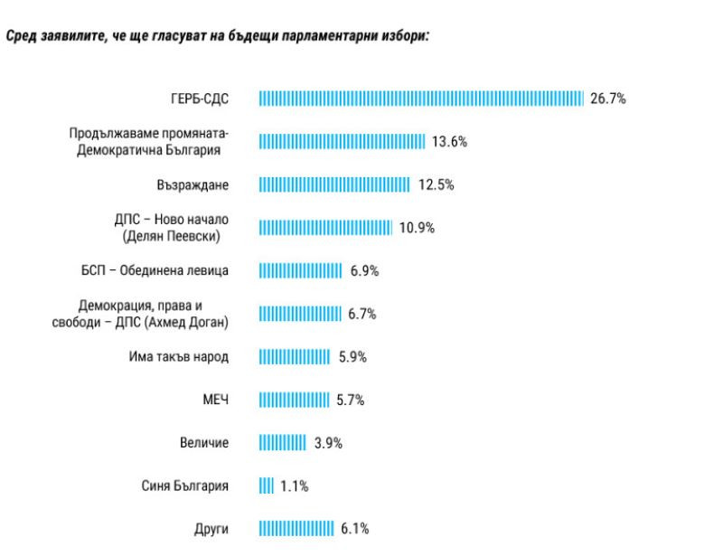 Моментните електорални настройки демонстрират, че при нови избори в Народното събрание биха влезнали 8 партии. ГЕРБ-СДС е първа политическа мощ с 26.7%. На второ място се подреждат ПП-ДБ с 13.6%. Челната тройка се добавя от Възраждане с 12.5.