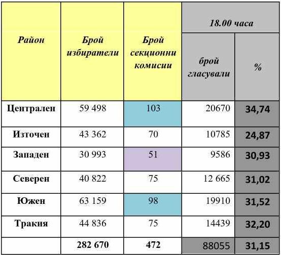 Припомняме, че над 288 000 са по изборни описи пловдивчаните, които имат право на глас. В регион „ Централен ” те са 59 498. В регион „ Източен ” – 43 362, регион „ Западен ” – 30 993, регион „ Северен ” – 40 882, регион „ Южен ” – 63 159, регион „ Тракия ” – 44 836).