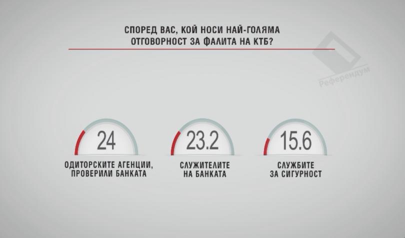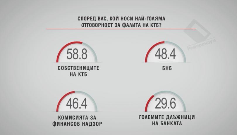 Близо 60 на 100 считат, че притежателите на КТБ носят най-голяма отговорност за банкрута на банката, 48% - че това е Българска народна банка, а 46% - Комисията за финансов контрол.