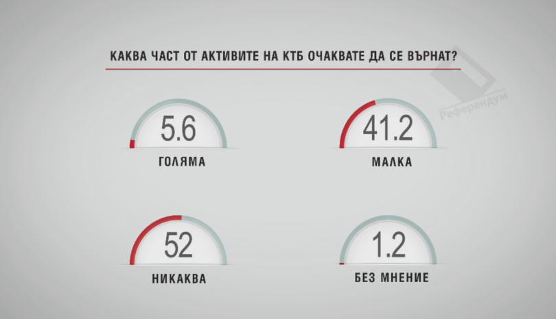 Малко над 50 на 100 считат, че никаква част от активите на КТБ няма да бъде върната, а 41% са на мнение, че това ще е една доста дребна част.