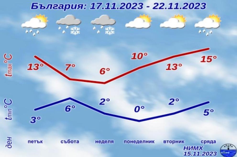 През нощта против неделя в източната половина от страната вятърът ще стане северен, а преваляванията ще се усилят, в североизточните региони ще са значителни; с продължаващото захлаждане, дъждът ще премине в сняг. В неделя ще остане прохладно, ще бъде и студено. Валежите ще отслабнат и в по-голямата част от страната ще спрат; от северозапад и облачността ще се раздра и до края на деня ще намалее. Това сочи прогнозата на Национален институт по метеорология и хидрология.
