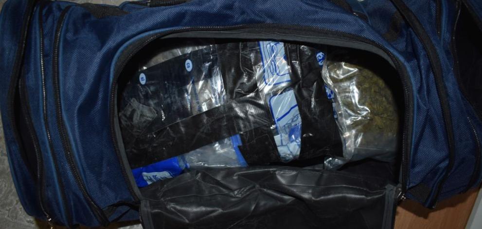 Министерство на вътрешните работи При осъществено претършуване са били открити две найлонови чанти, съдържащи хероин и сложени под шофьорската седалка.