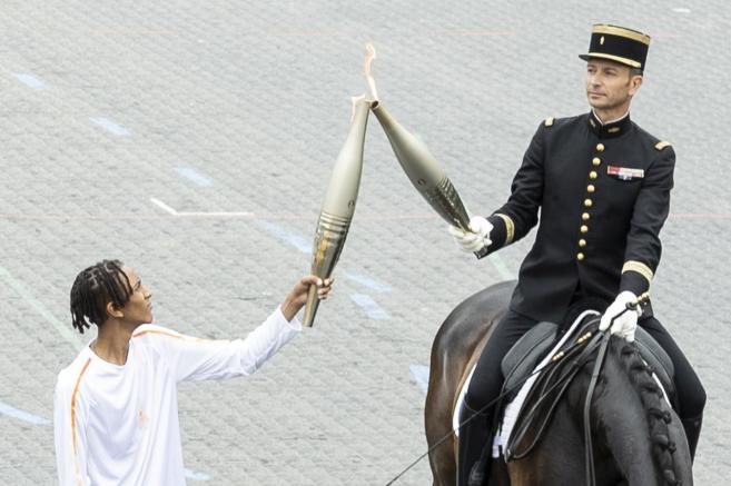 Огънят беше ескортиран от конни ездачи, 25 факлоносци и кадети, оформящи формите на олимпийските кръгове. Полковник Тибо Вале от елитното кавалерийско учебно заведение Cadre Noir de Saumur и притежател на златен орден по конен спорт от Олимпиадата в Рио през 2016 година беше основният факелоносец. Присъстваха още президентът на Франция Еманюел Макрон, кметът на Париж Ан Идалго, ръководителят на Организационния комитет на Игрите Тони Естанге и някогашният футболен национал Тиери Анри.