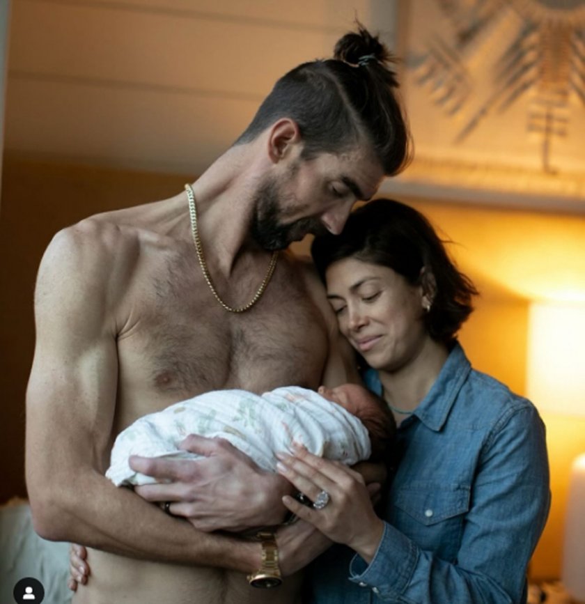 Фелпс, който е най-титулуваният олимпиец на всички времена, е предпочел да не носи горна дреха за фрагмента, разкривайки пред почитателите си към момента изваяната си спортна фигура. Именно в неговите ръце спи и новата им наслада - синът им Нико Майкъл.