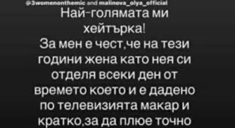 " Най-голямата ми хейтърка. За мен е чест, че на тези години жена като нея отделя всеки ден от времето си, което й е обещано по малкия екран, въпреки и малко, с цел да плюе тъкмо мен с такава ненавист. Благодаря ти. Сигурно съм доста специфична ", написа Габи, по-известна като Бланко под фотографията на телевизионерката.