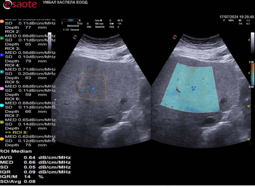 Клиниката по гастроентерология на УМБАЛ Каспела разполага с ехографски апарати от последно потомство на водещи производители- Hitachi Aloka, Philips, Esaote. Освен рутинната ехография те оферират и програмен продукт за качествена и количествена оценка на чернодробната стеатоза и фиброза- pSW и 2D еластография, QAI - количествена оценка на чернодробното омазняване.