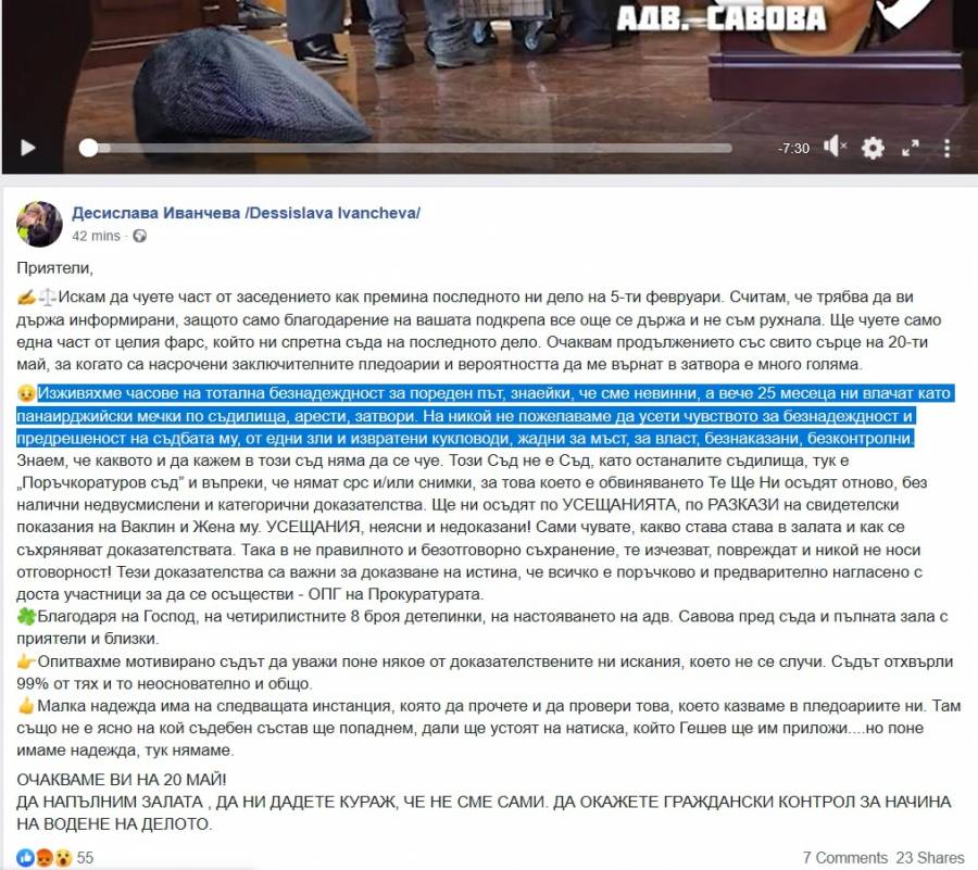 Опасение, че ще бъде наказана на база " чувства " и „ разкази на свидетелски показания ” изрази във Фейсбук някогашната кметица на " Младост " Десислава Иванчева.