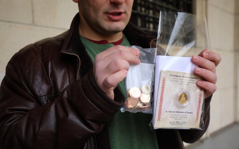 Късметлия е съумял да се снабди с първите български евромонети и да си купи последната златна възпоменателна монета с български номинал от 100 лв., изобразяваща „ Св. Патриарх Евтимий Търновски “. Нейната цена е 2590 лв.. Снимка: Светломир Стоянов