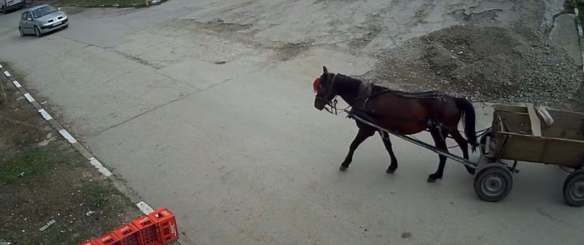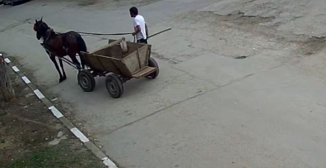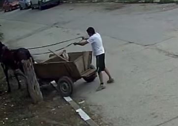 В този миг по пътя минало и невръстно дете с тротинетка. Конят с каруцата траял да се движи, следван от мъжа, който след това го блъснал отново, а след това се скрили от полезрението на камерите.