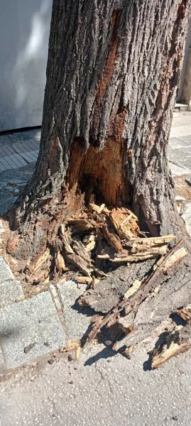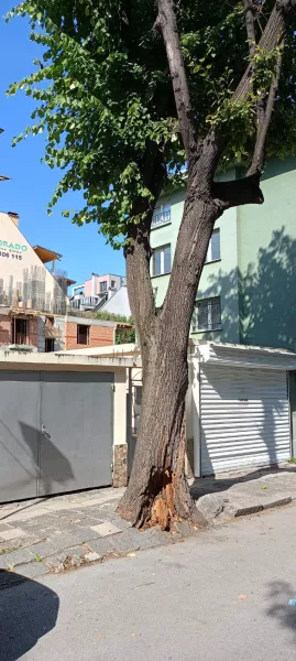„ Две трети от основата на дървото ги няма. Ние сме 6-членно семейство с две дребни деца, живеещи на дребна пренаселена улица от коли и доста съседи. Дървото е с височина 4-етажна кооперация, в случай че падне ще нанесе големи материални, а не дай Боже и други вреди “, се показва в сигнал до медията ни.