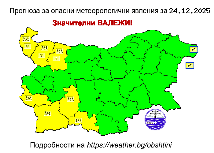 Предупреждението за Бъдни вечер е в действие за областите: Видин, Враца, Монтана, Кюстендил, Благоевград, Пазарджик и Смолян. В Северозападните региони се чака струпване на нова снежна завивка, а температурите ще стартират да падат още след обяд.