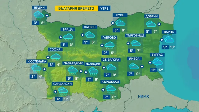 По Черноморието ще бъде облачно, основно по южното крайбрежие със слаби валежи от дъжд. Вятърът ще е сдържан, краткотрайно и мощен от североизток. Максималните температури ще са сред 10°-12°.
