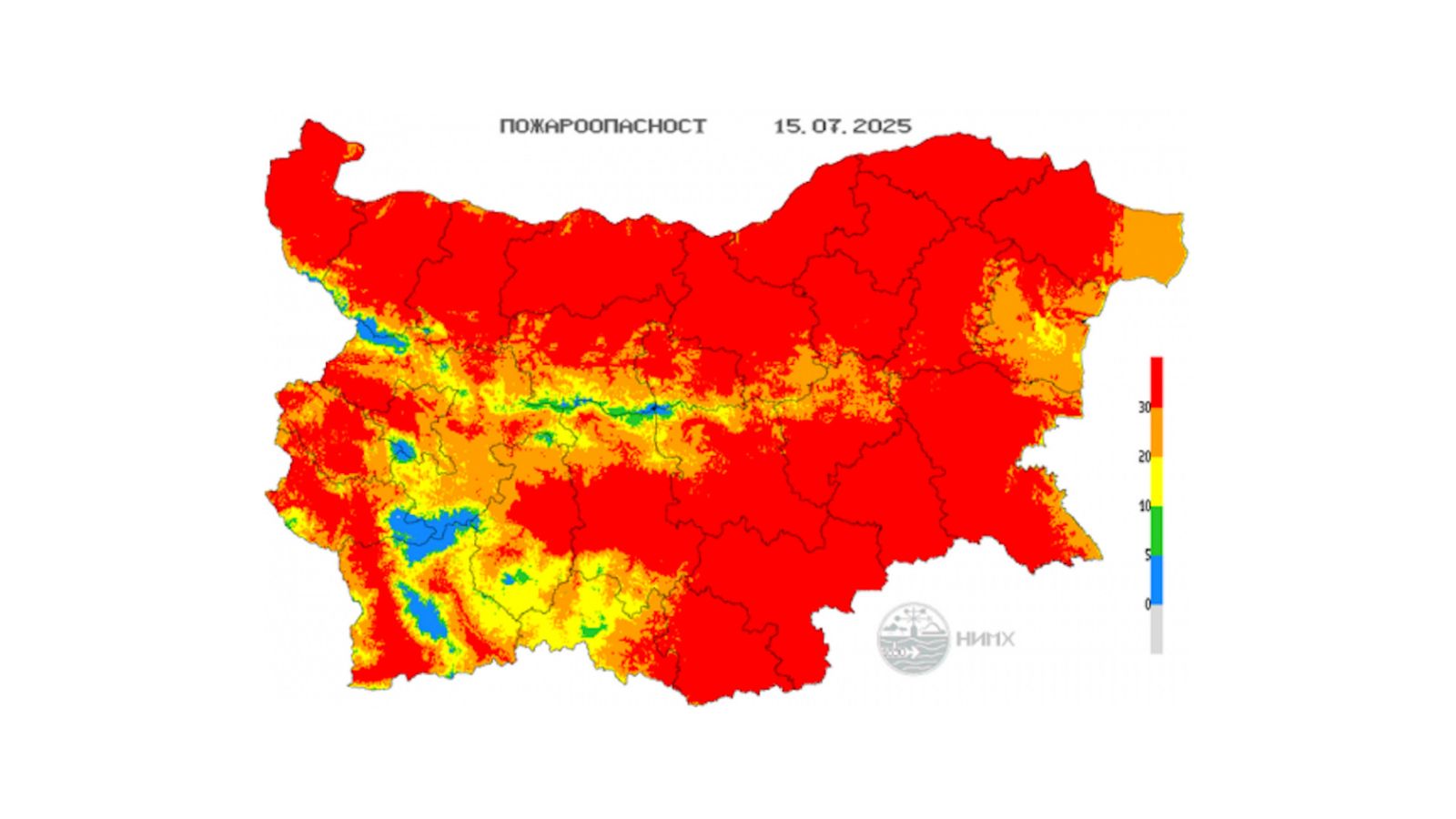 По данни на Националния институт по метеорология и хидрология съвсем за цялата страна в средата на юли е в действие " есктремален риск " за пораждане и бързо разпалване на горски и полски пожари. Влага, прохлада и повече зеленина има единствено във високия планински пояс. В ниските планински скатове, предпланинските региони и полетата влажността в повърхностния почвен пласт е минимална. Има и много суха растителност, написа Нова тв.