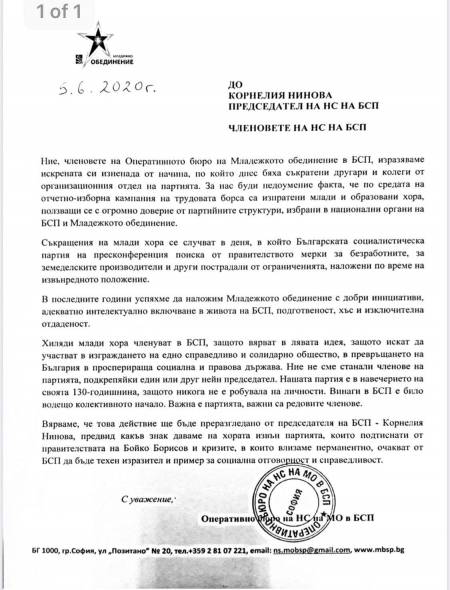 “Изразяваме откровената си изненада от метода, по който бяха съкратени приятели и сътрудници от Организационния отдел на партията. За нас буди недоумения фактът, че по средата на отчетно-изборна акция, с изцяло несъстоятелни причини, на трудовата борса са изпратени млади и образовани хора, ползващи се с голямо доверие от партийните структури, определени в национални органи на Българска социалистическа партия и Младежкото обединяване ”, пишат от управлението на мшадежката организацията. Те не пропущат и обстоятелството, че “съкращенията на младежи се случват в деня, в който Българската социалистическа партия на конференция изиска от държавното управление ограничения за безработните, за аграрни производители и други, потърпевши от рестриктивните мерки на изключителното състояние.