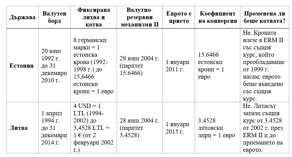 Естония и Литва – образци за финансова последователностЕстония вкарва валутен ръб още през 1992 година, в началото закрепен към немската марка, а по-късно към еврото. При влизането си в ERM II през 2004 година, страната резервира курса 15.6466 крони за евро, който остава неизменен и при приемането на еврото през 2011 г.Литва минава към фиксация към еврото през 2002 година, заменяйки щатския $ като котва. Валутният курс 3.4528 лита за евро също остава постоянен до присъединението към еврозоната през 2015 година