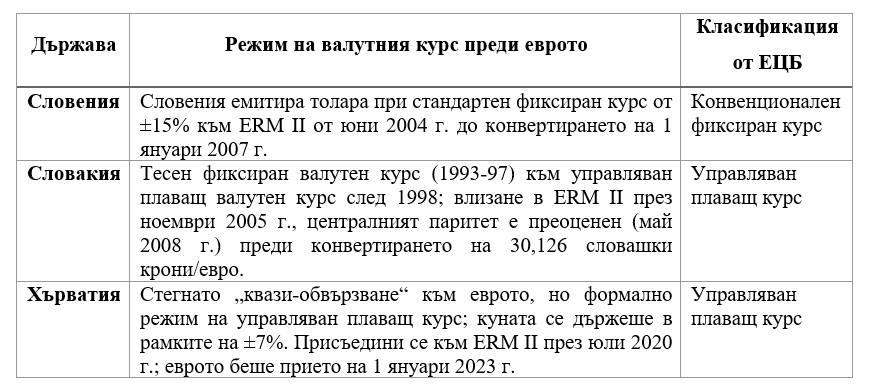 България следва модела на Естония и Литва, като съблюдава закрепения курс в границите на ERM II и поддържа валутна непоклатимост. Този метод ускорява доверието, че преходът към еврото ще се случи без промени в курса, запазвайки стабилността на стопанската система и сигурността на спестяванията.