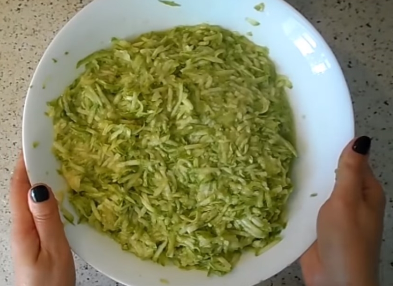 Белените тиквички настържете на ренде, осолени. Разбърква се добре и се оставят за 10 минути.