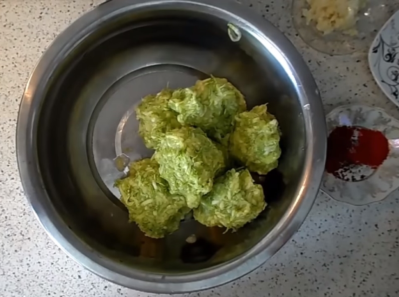 Тиквичките изстискайте добре, с цел да отстраните сока.
