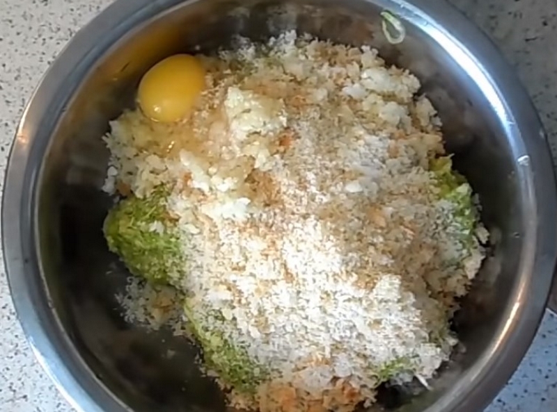 Към изцедената каша от тиквички се прибавят хляба, чесъна и яйцата. Пипер и разбъркайте добре.