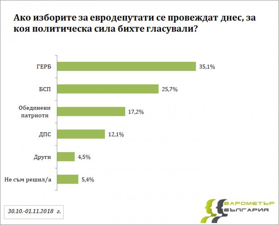 На въпрос „ Ако изборите за евродепутати се организират през днешния ден, за коя политическа мощ бихте дали своят вот? “ 35,1% дават отговор за ГЕРБ при 35,3% през юли, 25,7% - Българска социалистическа партия (28,9% през юли), 17,2% за Обединени патриоти (17,8% през юли), 12,1% - Движение за права и свободи (15,2% през юли). За други биха дали своят вот 4,5%, а 5,4% не са решили за коя партия да гласоподават ", разкриват още от Барометър "