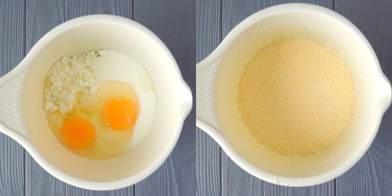 Включете фурната да загрее до 180 градуса. Комбинирайте изварата, киселото мляко и 2 яйца в дълбока купа. Разбийте с обсег.