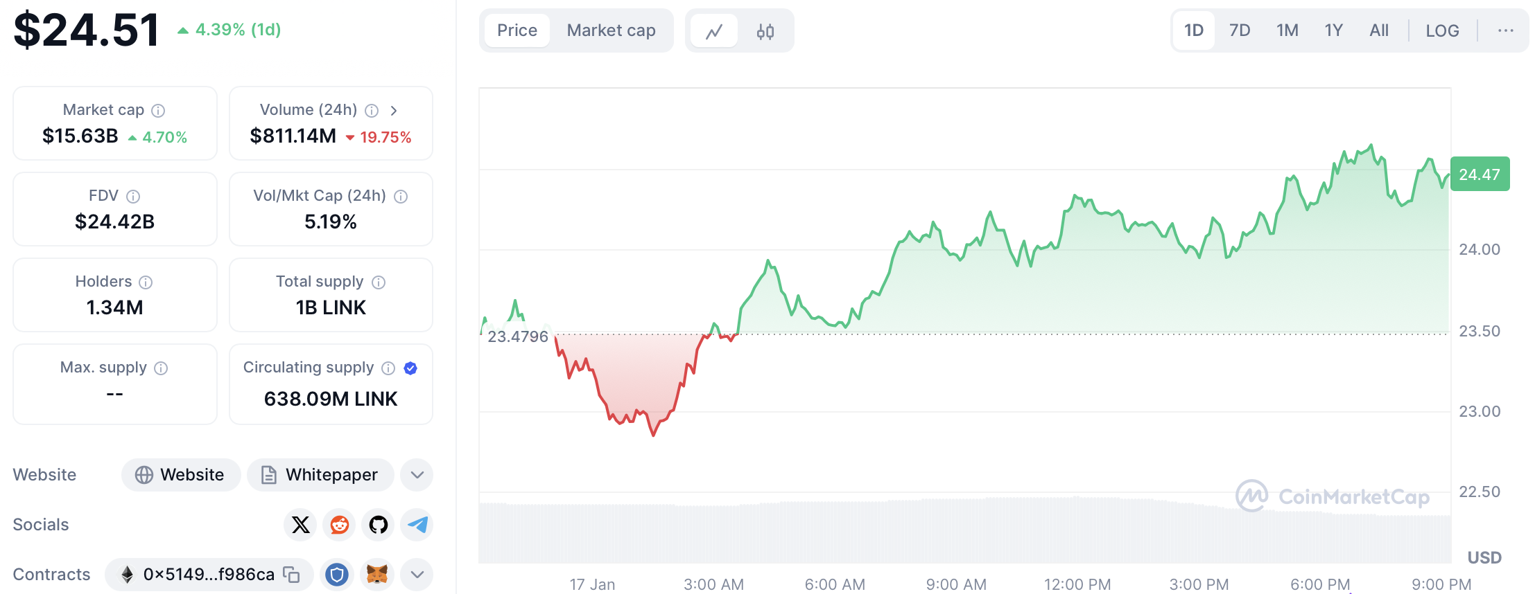 Понастоящем на цена от $24.51 с пазарна капитализация от $15.63 милиарда, Chainlink може да доближи оценка от $20 милиарда, което се равнява на почти $39.19 за токен. Анализаторите плануват средносрочни ценови цели от $43 до $50, до момента в който моделите на изкуствения разсъдък оферират краткосрочни цели сред $30 и $35, което отразява оптимизма за растежа на LINK.