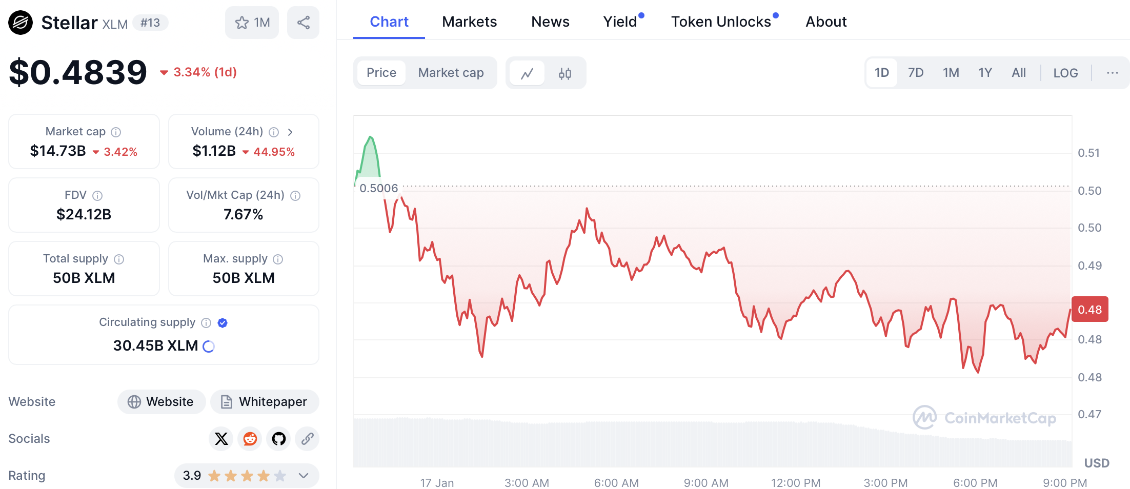 Stellar, който се търгува на цена от $0.4839 с пазарна капитализация от $14.73 милиарда, ще би трябвало да се повиши до $0.82, с цел да доближи етапната граница от $20 милиарда. Ключови партньорства с MoneyGram, Circle и централни банки утвърдиха ролята на Stellar в трансграничните заплащания и блокчейн инфраструктурата, като усъвършенстваха репутацията ѝ в региона на цифровите финанси.