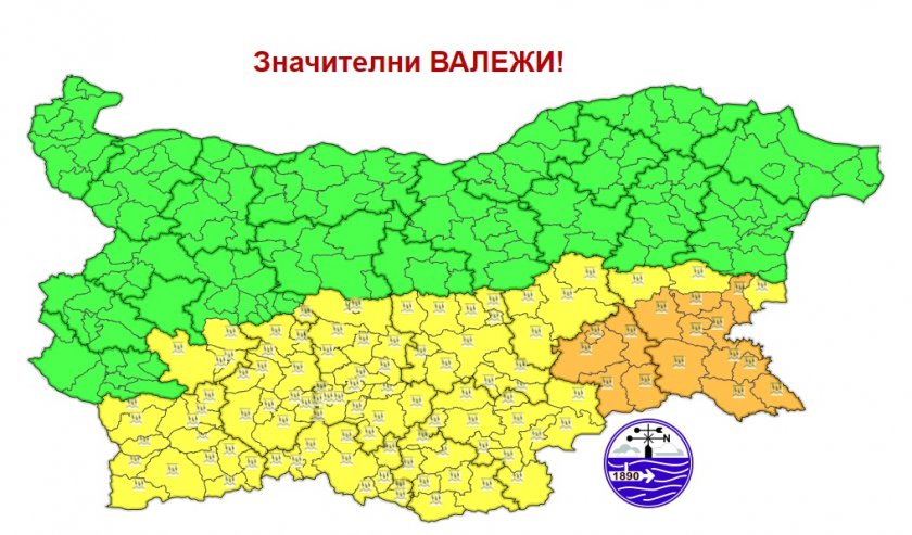 Жълт код е в действие за девет области от южната и югозападната част на страната. Там се чакат количества на преваляванията сред 20 и 35 литра на квадратен метър.