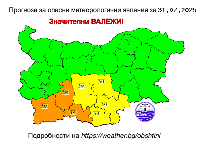 Оранжев код е публикуван за Благоевград, Смолян и Пазарджик, а жълт код е разгласен за Пловдив, Кърджали, Хасково и Стара Загора.