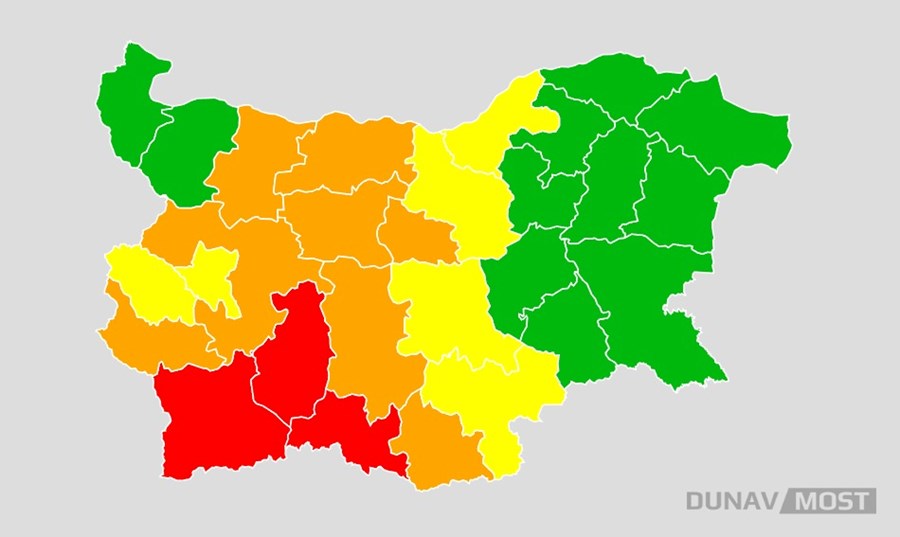 Оранжев код е разгласен за областите Благоевград, Кюстендил, София-област, Пловдив, Кърджали, Хасково, Ловеч, Плевен и Враца. За огромна част от страната важи жълт код. Без предизвестия за рисково време са областите в Източна България и Видин.