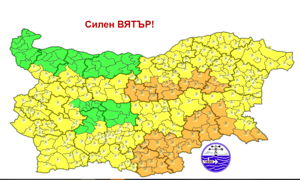 В 18 области на страната е в действие жълт сигнален код за мощен вятър – Благоевград, Варна, Враца, Добрич, Кюстендил, Ловеч, Монтана, Пазарджик, Перник, Пловдив, Русе, Разград, Силистра, Сливен, Смолян, София град, София област, Стара Загора. В тези области се чака поривите напразно да доближат 22-24 м/сек.
