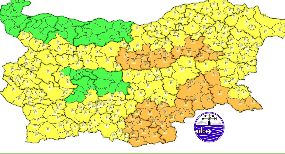 В 18 области на страната е в действие жълт сигнален код за мощен вятър – Благоевград, Варна, Враца, Добрич, Кюстендил, Ловеч, Монтана, Пазарджик, Перник, Пловдив, Русе, Разград, Силистра, Сливен, Смолян, София град, София област, Стара Загора. В тези области се чака поривите напразно да доближат 22-24 м/сек.