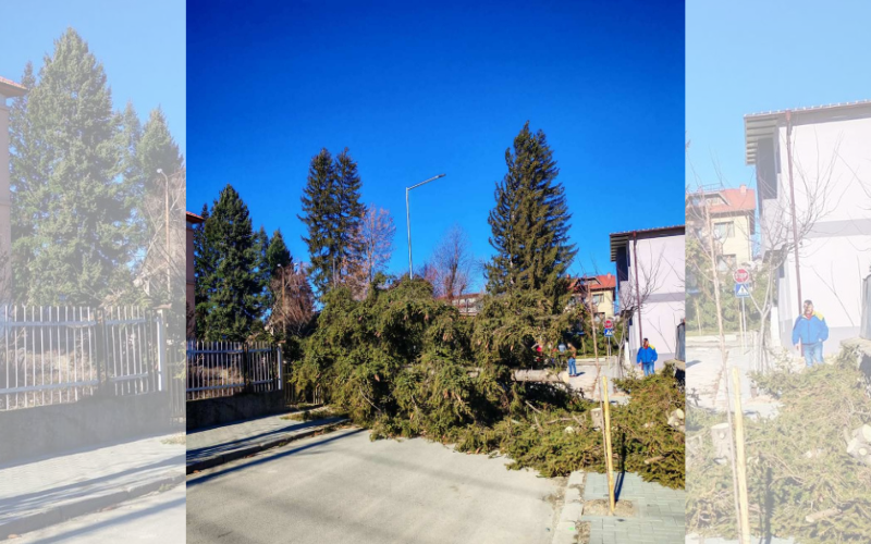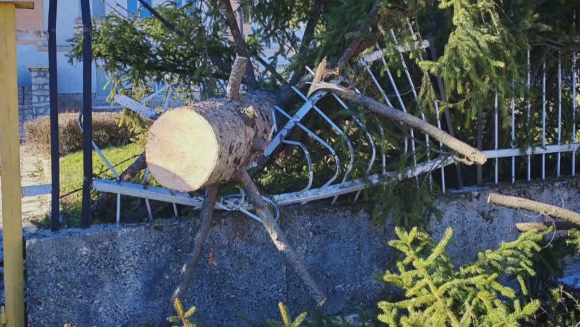 В Добринище бурният вятър повали десетки полувековни ели и събори билборд в центъра на града. Местни поданици споделят, че не помнят сходна стихия.