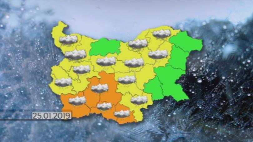 Оранжев код за превалявания от 30 до 50 литра на квадратен метър и заплаха за формиране на поледици е разгласен през днешния ден за пет области от Югозападна България.