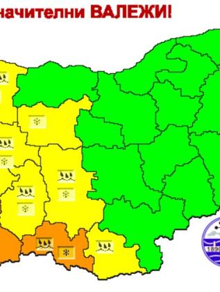 Жълт сигнален код е публикуван за 11 области на страната - Видин, Враца, Кърджали, Кюстендил, Ловеч, Монтана, Пазарджик, Перник, Пловдив, София град, София област. В Кюстендил, Перник и София град предизвестието е за превалявания от сняг, формиране на снежна завивка и замръзване. В останалите осем области се чака да вали и дъжд, и сняг.