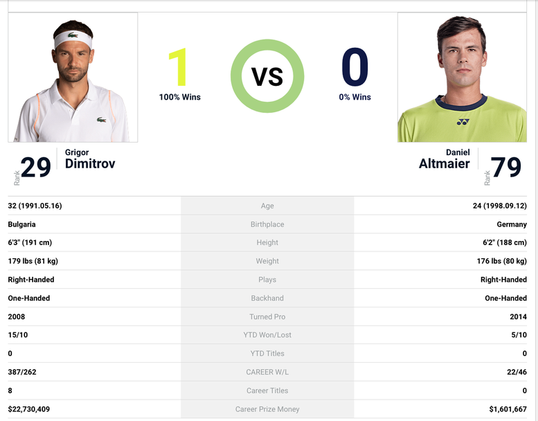 Двамата са играли единствено един път в ATP тура до този миг - на “Мастърс ”-а в Индиън Уелс през 2021-ва, когато българинът побеждава германеца с 6:4, 6:2.