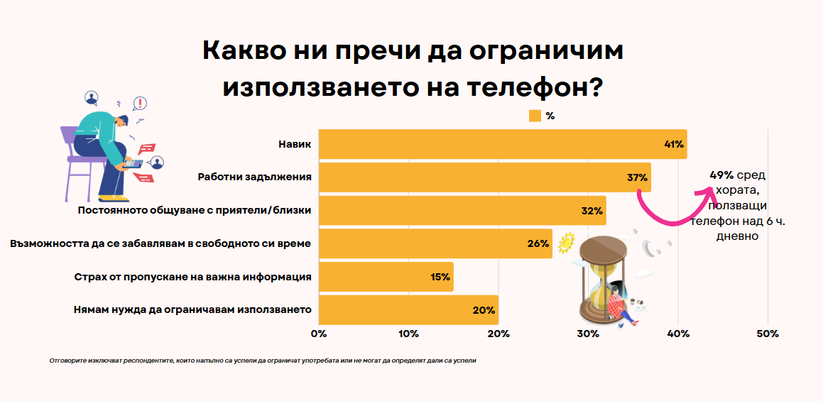 Въпрос на табиет? Да - това е водещата " преграда " пред цифровата пауза за 41% от всички участници в проучването. Всеки четвърти човек споделя, че не може да се откаже от телефона, тъй като той му дава опция да се забавлява в свободното си време.