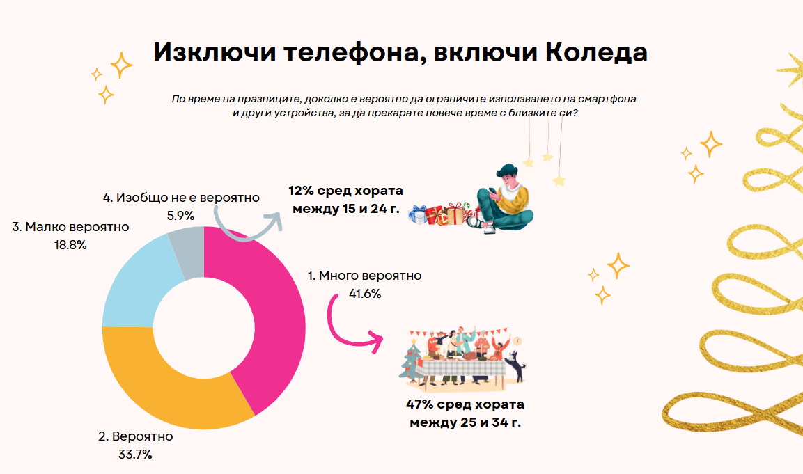 76% от всички интервюирани споделят, че празниците са времето, в което е най-вероятно да се отделят от телефоните, с цел да се посветят на своите близки.