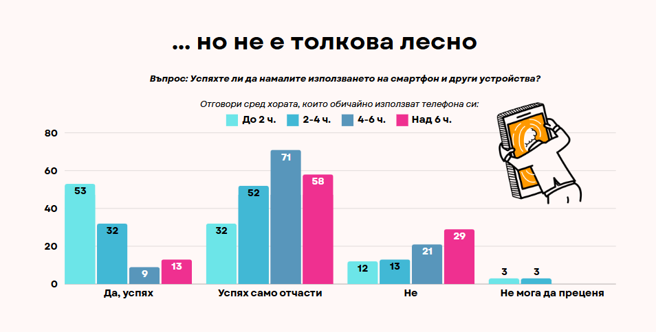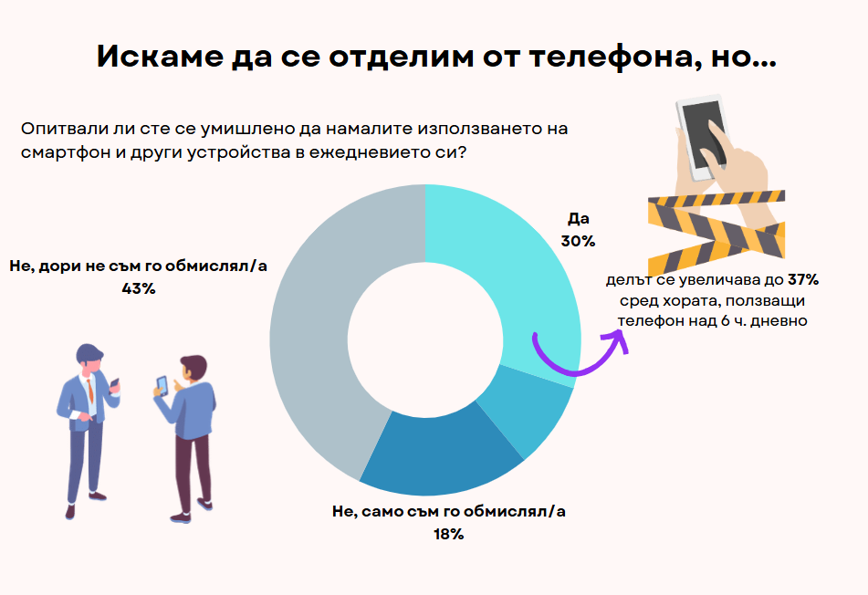 Най-добре знаят какъв брой значимо е това точно хората, които стоят по повече от 6 часа на телефона - две трети от тях са опитвали или възнамеряват да лимитират използването на смарт телефон или други устройства във всекидневието си.